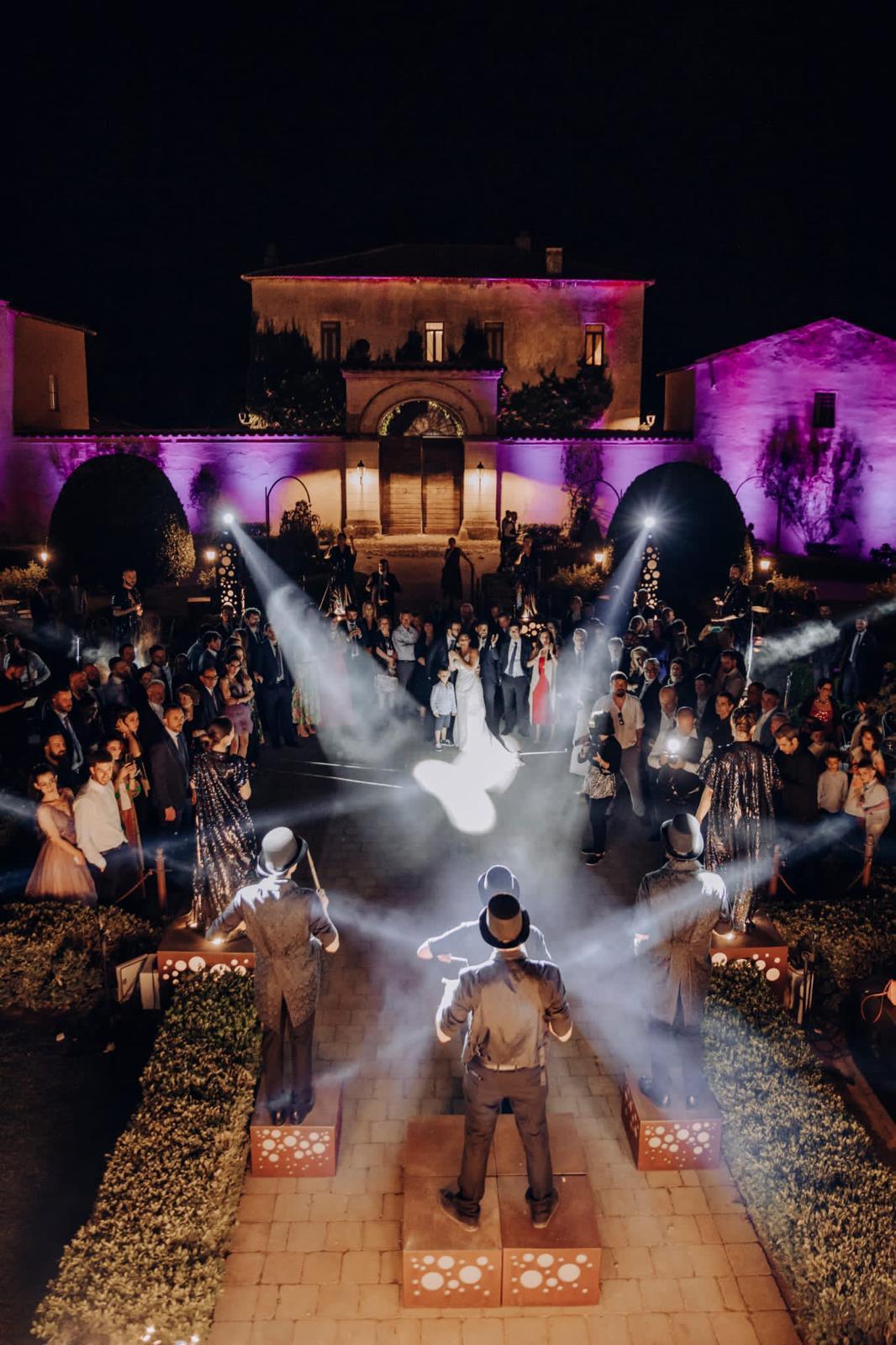 Dopo la cena, le luci si abbassano, la musica cambia tono e l’evento si trasforma in una vera e propria festa. È il momento in cui l’energia prende il sopravvento e tutti – sposi e ospiti – possono lasciarsi andare, ballare, cantare, vivere la notte.