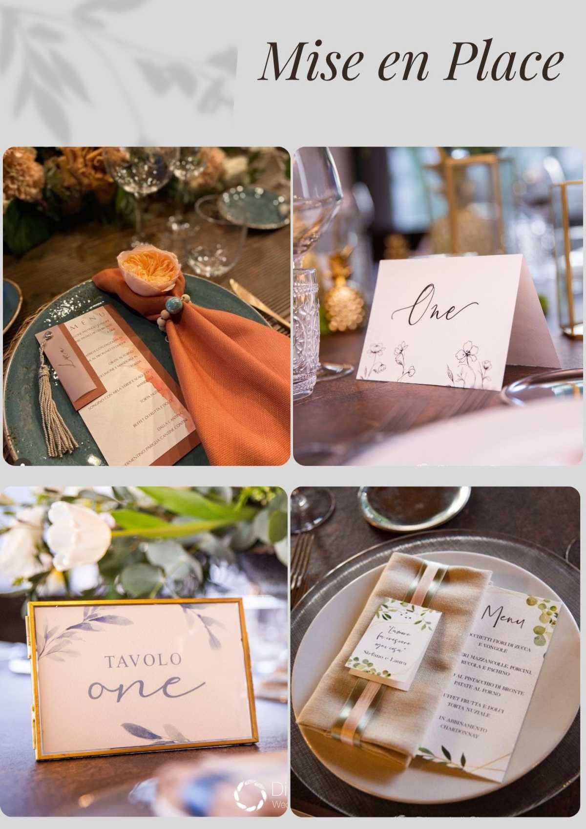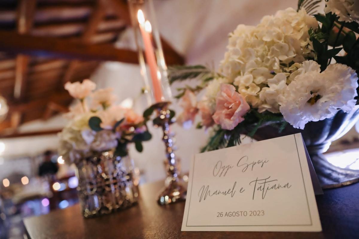 Per la sala si sceglie il colore del tovagliolo e lo stile della piegatura, il formato del menù e – se desiderato – il modo di presentarlo: con un nastro, un sigillo, o un dettaglio grafico coordinato. Il segnatavolo indica il nome o il numero di ciascun tavolo, diventando parte integrante dell’allestimento.